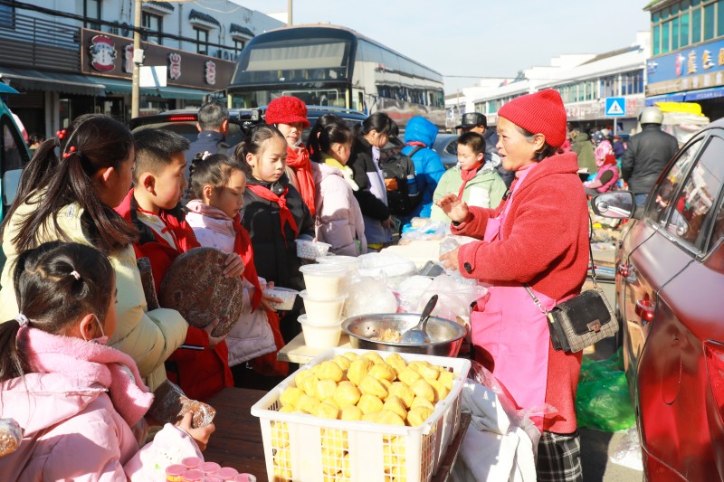 托班开班首日恰逢赤岸大集,也是春节前的最后一个赶集日。集市上年味浓郁、热闹非凡,马路两旁的摊位琳琅满目,各式年货一应俱全。红彤彤的年画、对联,做工精细的发禄袋,瞬间点燃了孩子们的年味热情;暖阳下,酱肉、香肠、酱鸭等腊味滋滋冒油,醇厚香气四处飘散;各类干货堆积如山,新鲜瓜果蔬菜鲜嫩欲滴,铁制农具坚实厚重,手编竹器精巧别致,娇艳鲜花与绿植相映成趣,构成了新农村最鲜活的年味画卷。孩子们人手一本精心制作的“赶集探索手册”,像小小探秘者般专注打量每一样传统年货。他们睁大眼睛端详形态各异的商品,不时向摊主虚心请教咸鱼、咸肉的腌制窍门,探寻传统年糕的制作步骤,还认真聆听长辈们讲述掸檐尘、蒸糕做团子、送灶、家祭、贴春联等家乡过年习俗。在问答之间读懂年味、铭记乡愁。
